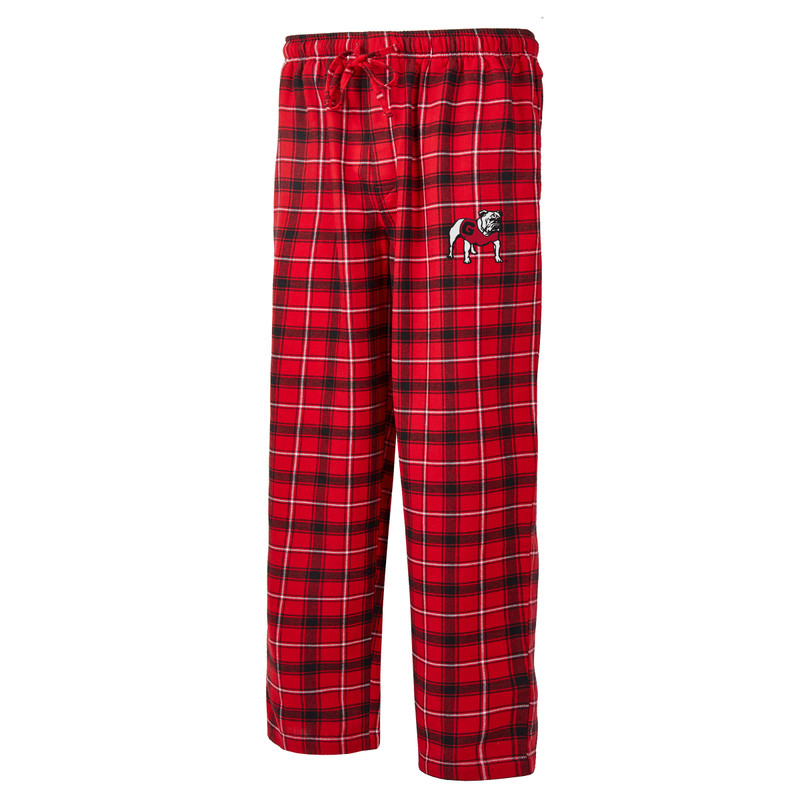 Catch some Zs and dream about the Bulldogs in these comfy Georgia Bulldogs Red Flannel Sleep Pants. Whether you're lounging around watching the big game or catching up on some homework, these Bulldogs Plaid Flannel Lounge Pants will keep you relaxed and comfortable. These Sleep Pants feature an embroidered mascot on left hip. Made of a cotton/poly blend material. 31� Inseam. Machine Washable.