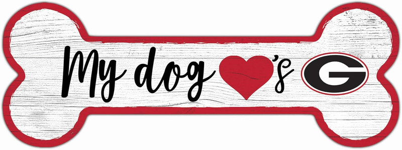 Fan Creations NCAA University of Georgia Bulldogs My Dog 'Hearts' Georgia 6''x12'' Hanging Wood Sign. This beautifully made 6'' by 12'' dog bone shaped wood sign features a weathered design. This sign proudly displays the University of Georgia colors and logo. Signs are manufactured with a rope for easy hanging. All signs are constructed from cabinet grade MDF wood and digitally painted directly to the surface of the sign to provide the highest quality product in the market. This is the perfect addition to the home of any Dawgs (and dog) fan, whether for yourself or someone you know. Officially licensed signs are courtesy of Fan Creations and made in the USA.
