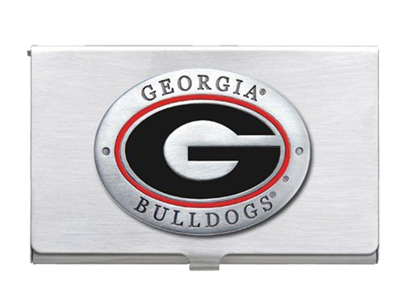 Carry your business cards with your favorite team's logo. This officially licensed Georgia Bulldogs business card case is constructed of stainless steel featuring a fine pewter decorative casting. The hinged case is perfect for carrying your cards in a neat and impressive manner. Assembled in USA.?Heritage Pewter has been hand-crafting fine pewter gifts since 1988. They offer an array of pewter products, ranging from barware to wind chimes, golf clubs to coffee mugs. These gifts are customized with beautiful a pewter designs of college logo. Approximate Dimensions are 3.75 inches long by 2.5 inches wide